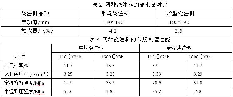 固定骨料和細粉的質(zhì)量比為70:30 ,通過優(yōu)化澆注料的粒度分布和原料組成以及對生產(chǎn)工藝進行調(diào)整到新型澆注料 按常規(guī)澆注料和新型澆注料的設(shè)計配比配料,混合均勻加入適量分散劑和水?dāng)嚢杈鶆颍駝訚沧⒊尚蜑?/FONT>40mmX40mmX160mm的試樣,經(jīng)干燥、高溫?zé)崽幚砗髾z測其各項性能。 流動值的測定方法參考跳桌法:試驗錐尺寸為φ70/100mmX60mm,垂直移去試驗錐后在振動臺上振動60s,測量三處直徑的平均值作為振動流動值。 2 試驗結(jié)果 2.1 常規(guī)性能對比 兩種澆注料在振動流動值為180~190mm條件下的加水量(需水量)見表2,新型澆注料的需水量顯著降低。這一方面有利于澆注體致密度和強度的提高,另一方面可以改善澆注料的泌水性。成型過程中發(fā)現(xiàn),新型澆注料長時間振動顆粒不沉降,基質(zhì)不返漿,表明澆注料泌水性確實得到改善:從不同溫度熱處理后試樣的常規(guī)性能(見表3)可以看出,新型澆注料的致密度和強度確實顯著提高。