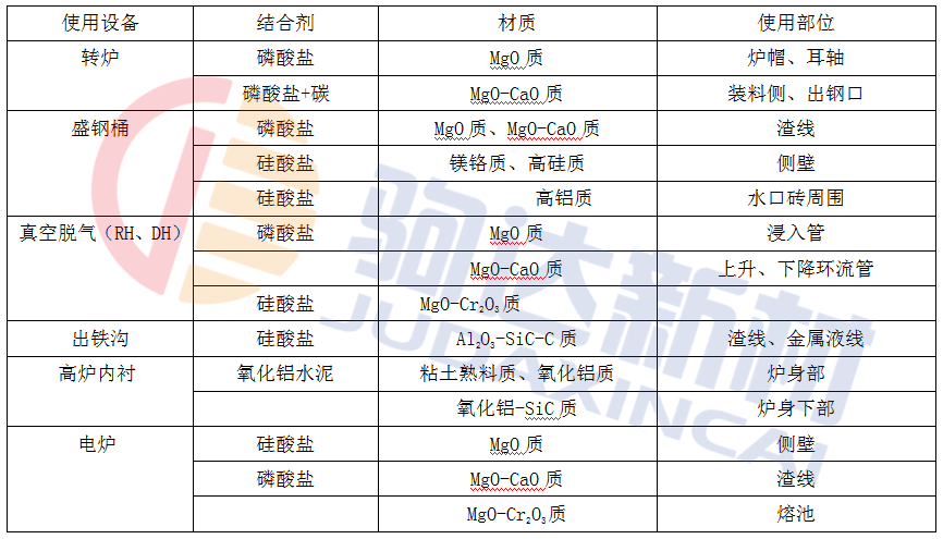 耐火噴補(bǔ)料按施工方法分濕法(泥漿法)噴補(bǔ)料、半干法(噴嘴混合式)噴補(bǔ)料和火焰法(熔射法)噴補(bǔ)料;按噴補(bǔ)料主材質(zhì)可分為氧化鎂質(zhì)、鈣鎂質(zhì)、鎂鉻質(zhì)、鎂碳質(zhì)、硅酸鋁質(zhì)和氧化鋁—碳化硅—碳質(zhì)噴補(bǔ)料等;按使用條件分為轉(zhuǎn)爐用噴補(bǔ)料、電爐用噴補(bǔ)料、盛鋼桶用噴補(bǔ)料、真空脫氣爐(RH、DH)用噴補(bǔ)料、出鐵溝用噴補(bǔ)料和高爐內(nèi)襯用噴補(bǔ)料等。不同冶金爐和裝備用噴補(bǔ)料材質(zhì)與結(jié)合劑見表9-7。