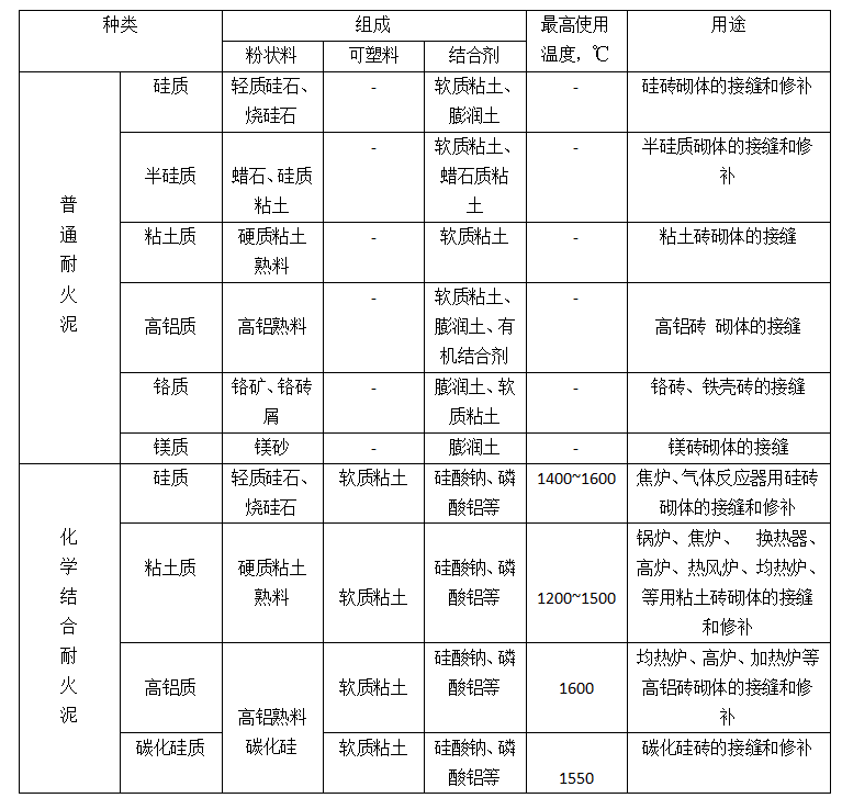 耐火泥漿按材質(zhì)分為粘土質(zhì)、高鋁質(zhì)、硅質(zhì)、鎂質(zhì)、鉻質(zhì)、含碳質(zhì)等。其組成及用途見(jiàn)表1-1。