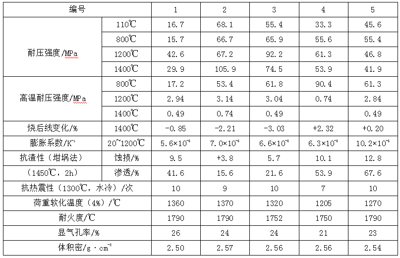 耐火搗打料混煉后,模仿風(fēng)鎬搗打襯體的體積密度,在壓力機(jī)上制樣。試樣自然養(yǎng)護(hù)3d,進(jìn)行烘干并作性能檢測(cè)。其檢驗(yàn)結(jié)果,見(jiàn)表1-2,。編號(hào)與表1-1對(duì)應(yīng)。