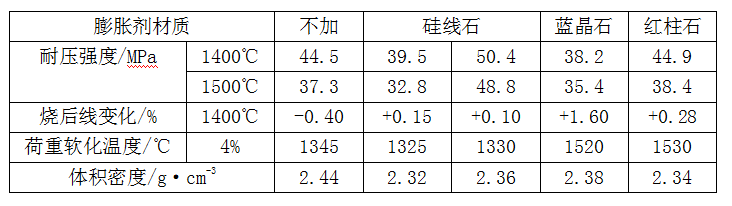 應(yīng)當(dāng)指出,作為膨脹劑材料,藍(lán)晶石效果最好,1400℃燒后線變化由-0.4%增加到+1.6%。