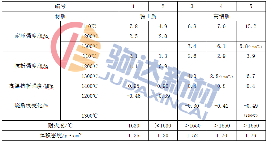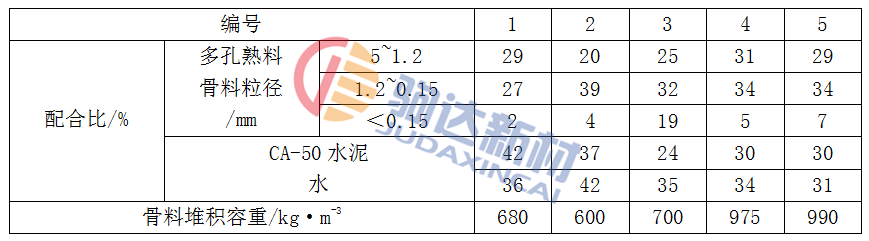 普通多孔熟料耐火澆注料分為黏土質(zhì)和高鋁質(zhì)兩種,體積密度為1.1~1.8g/cm3,使用溫度為1300℃和1400℃多孔熟料骨料的最大粒徑為5mm,一般用CA-50水泥配制,其配合比列于表1-1。同時,為了說明各編號材料的性能區(qū)別,也列出了多孔熟料骨料的堆積容重。按照多孔熟料耐火澆注料配合比的要求,首先稱量各種原材料后加水混練,振動或手工振動成型,自然養(yǎng)護1天拆模,然后繼續(xù)養(yǎng)護2d。在養(yǎng)護期間,不得淋水,因拌和水量大,足以滿足CA-50D水泥水化的需要。表1-2為普通多孔熟料澆注料的性能。表中編號與表1-1的對應(yīng)。