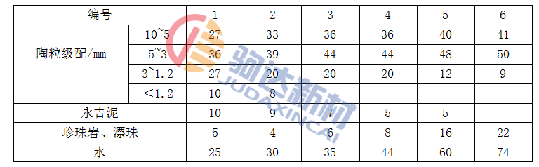 表1-1 頁巖陶粒澆注料的陶粒級(jí)配及輔料用量