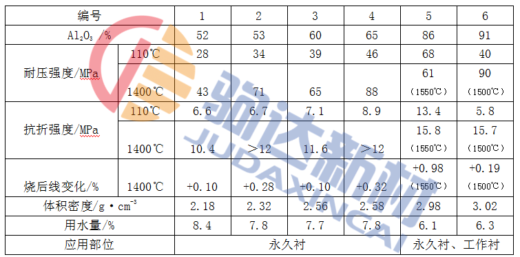從表1-1可以看出,硅酸鋁質(zhì)、鋁鎂尖晶石質(zhì)和剛玉鎂尖晶石質(zhì)自流耐火澆注料的性能是優(yōu)良的、強(qiáng)度較高,燒后線變化均呈膨脹狀態(tài),有利于使用。另外,編號(hào)1和編號(hào)2的350℃熱導(dǎo)率約為0.62W(m·K),也有利于保溫隔熱。