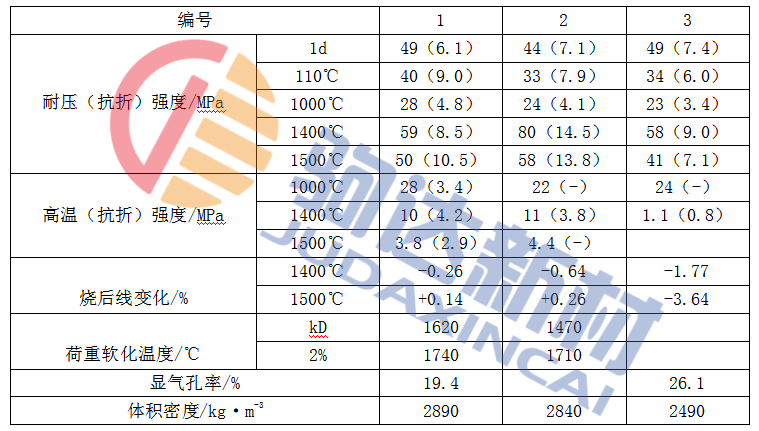 電熔鋁酸鹽水泥耐火澆注料配制時,水泥用量為18%,耐火粉料采用電熔剛玉粉,耐火骨料最大粒徑為5mm,其顆粒級配(%)為:5~3mm,30~40;3~1m;25~30mm;<1mm,35~45。同時用緩凝劑和減水劑等復合外加劑。該澆注料成型初凝后,因水化熱在8h內(nèi)放出較多,故應(yīng)在潮濕環(huán)境中自然養(yǎng)護,或進行標養(yǎng),但不宜放進水中養(yǎng)護。養(yǎng)護到期后,檢驗常溫強度。烘干后,檢驗各種高溫性能,詳見表1-1。表中編號1、編號2和編號3,分別用電熔剛玉、燒結(jié)剛玉和一級礬土熟料作耐火骨料,其水用量分別為9%,8.7%和12%。從表中看出,1天常溫耐壓強度達到43~50MPa,顯示了快硬旱強的特點,其強度已占總強度的80%左右。
