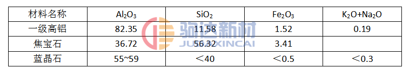 根據(jù)上述鍛造加熱爐爐門(mén)破損原因分析,鄭州駒達(dá)新材料認(rèn)為通過(guò)合理選擇澆注料的原材料,組分配比的調(diào)整和外加劑方面的研究,可以改善爐門(mén)澆注料的使用性能,達(dá)到提高爐門(mén)使用壽命的目的。為此,在爐門(mén)澆注料的原材料選擇方面進(jìn)行了相應(yīng)的研究與分析。選取了耐火度、抗熱震性及高溫抗沖刷性能優(yōu)良的特級(jí)焦寶石和一級(jí)高鋁熟料作為澆注料的骨料,以改善澆注料的高溫性能。從改善澆注料的常溫與高溫結(jié)合強(qiáng)度、體積穩(wěn)定性等方面考慮,選取一級(jí)高鋁粉為澆注料的主要粉料,水泥及微粉為復(fù)合結(jié)合劑,藍(lán)晶石為膨脹添加劑,水泥及微粉為復(fù)合結(jié)合劑,藍(lán)晶石為膨脹添加劑。從改善澆注料的常溫與高溫結(jié)合強(qiáng)度、體積穩(wěn)定性等方面考慮,選取一級(jí)高鋁粉為澆注料的主要粉料,水泥及微粉為復(fù)合結(jié)合劑,藍(lán)晶石為膨脹添加劑。從改善澆注料抗熱震性、防暴性和降低密度方面考慮,選取了力學(xué)性能與抗高溫粉化性能優(yōu)良的無(wú)機(jī)高鋁纖維為防爆、增強(qiáng)添加劑。此外,為了滿足鍛造加熱爐爐門(mén)澆注料的施工性能和其他相關(guān)的使用性能,選擇了多種有機(jī)與無(wú)機(jī)減水劑、分散劑為復(fù)合外加劑。澆注料主要原材料的理化性能如表1所示。