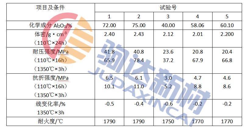 根據(jù)上述的原材料選擇原則與澆注料性能改進(jìn)思路,按照澆注料中Al2O3的含量不同進(jìn)行了多個(gè)配方設(shè)計(jì),并在實(shí)驗(yàn)室進(jìn)行了配方調(diào)整實(shí)驗(yàn)機(jī)抗熱震性實(shí)驗(yàn)。按照實(shí)驗(yàn)預(yù)定的高抗熱震性技術(shù)要求,確定了5個(gè)性能優(yōu)良的澆注料配方,分別制成40mm×40mm×160mm的試樣進(jìn)行詳細(xì)的理化性能檢測(cè),具體檢測(cè)結(jié)果如表2。