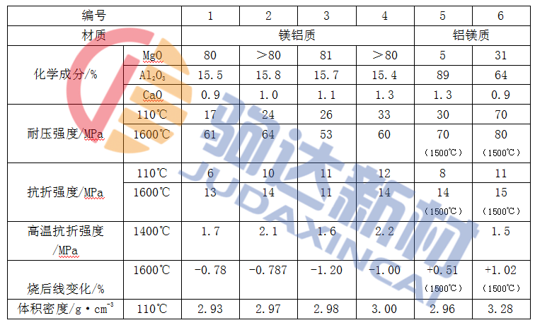 表1-1 高純鋁鎂(鎂鋁)質耐火澆注料的性能