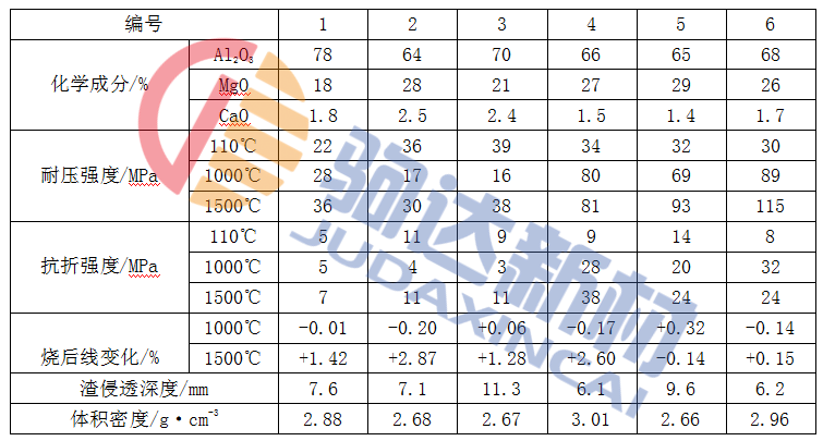 表1-2為鋁鎂尖晶石質耐火澆注料的性能。表中耐火骨料均為鎂鋁尖晶石,臨界粒徑為10mm;耐火粉細度小于0.088mm的大于90%。編號2和編號4粉料用鎂鋁尖晶石粉,編號1為電熔和燒結氧化鋁混合粉,編號3為棕剛玉和燒結氧化鋁混合粉,編號5和編號6分別為剛玉、鎂砂混合粉和兩種鋁鎂尖晶石混合粉。為了強化料的基質,還添加了α-Al2O3he Cr2O3等超微粉。選用單一或復合材料作結合劑及其外加劑。抗渣試驗為坩堝法,溫度為1650℃,保溫2h;轉爐終渣m(CaO)/m(SiO2)比為2.75.按配合比的技術要求,水用量為5%~6.2%。試樣振動成型、自然養(yǎng)護3d后,再檢測各種性能。
