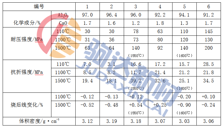 表1-1為高純度剛玉質(zhì)耐火澆注料的性能。表中編號(hào)1~編號(hào)3采用電熔白剛玉作耐火骨料及部分粉料;編號(hào)4和編號(hào)5分別采用板狀剛玉和致密剛玉作耐火骨料,用致密剛玉作部分粉料;編號(hào)6采用特級(jí)礬土熟料和電熔白剛玉作耐火骨料,用白剛玉作部分粉料。耐火粉料中均添加適量的α-Al2O3和SiO2超微粉;編號(hào)1用CA-80水泥作結(jié)合劑,其余編號(hào)料用CA-70水泥作結(jié)合劑。同時(shí),均添加分散劑和減水劑。該類水泥一般易速凝,影響施工性。一有此情況,應(yīng)添加草酸和檸檬酸鈉等緩凝劑,以保證澆注料的流動(dòng)性和密實(shí)型。從表中看出,Al2O3和CaO的總含量除編號(hào)4和編號(hào)6外都大于95%,高的達(dá)98.7%,說(shuō)明該料是高純度的。同時(shí),體積密度大,強(qiáng)度高,但1500℃或1600℃燒后變化除編號(hào)3和編號(hào)4外,均呈收縮狀態(tài)。