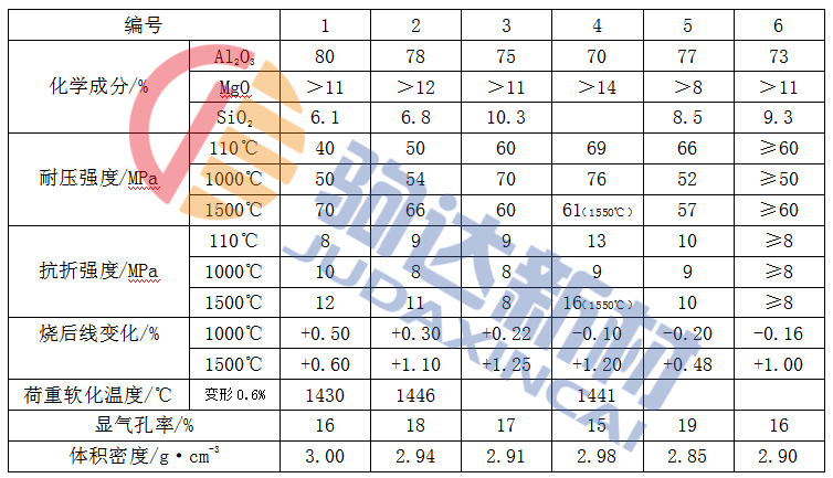 超微粉結(jié)合鋁鎂尖晶石質(zhì)耐火澆注料用的耐火骨料,主要是山西特級(jí)礬土熟料,Al2O3與TiO2含量約為90%,臨界粒徑約為25mm,一般采用連續(xù)顆粒級(jí)配,也有用間斷級(jí)配的;結(jié)合劑為活性的SiO2超微粉,SiO2大于91%,中直徑D50約為3um,另加聚磷酸鈉等分散劑和快干劑。其性能見(jiàn)表1-1;|(zhì)中均加高檔次的鋁鎂尖晶石粉、剛玉粉和α-Al2O3超微粉。表中編號(hào)1添加電熔鎂砂粉、剛玉粉和α-Al2O3超微粉。表中編號(hào)1添加電熔鎂砂粉,用量約為9%;編號(hào)2添加高純鎂砂粉,編號(hào)4添加MgO約為94%的燒結(jié)鎂砂粉,編號(hào)3、編號(hào)5和編號(hào)6則為中檔鎂砂粉。其細(xì)度均不大于0.088mm。