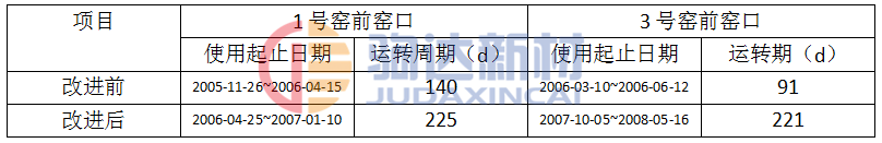 改進(jìn)前后對比如表1所示。經(jīng)過全方位優(yōu)化改進(jìn)后,窯口澆注料使用壽命實現(xiàn)了質(zhì)的飛躍,更換周期不但滿足了窯磚檢修的需要,甚至明顯超過了窯磚壽命,避免了檢修時廢舊澆注料難拆除的被動局面,自檢修以來,未再發(fā)生過因窯口澆注料而停窯檢修的情況。