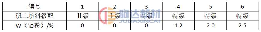 選定適當的原料顆粒級配,然后調節(jié)粉料和外加一些金屬鋁粉,稱好料,加水量的水,攪拌均勻,在振動臺上振動成型,養(yǎng)護1d后脫模,放入烘箱中在110℃24h烘干。試樣編號及粉料加入級別和金屬鋁粉加入量如表1所示。
