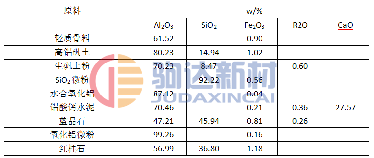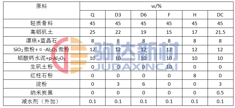試驗(yàn)用原料有:合成輕質(zhì)骨料、高鋁礬土熟料、漂珠、藍(lán)晶石、二氧化硅微粉、氧化鋁微粉、純鋁酸鈣水泥、以及造孔劑生礬土粉、紅柱石、淀粉、納米炭黑等。原料的化學(xué)組成見(jiàn)表1。