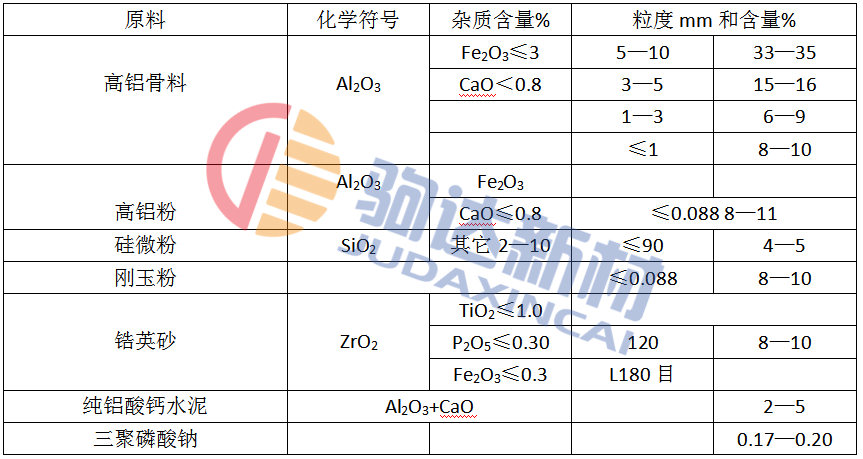 高強度耐火澆注料所用的原料,除了高鋁骨料、高鋁粉、微硅粉以外,還有剛玉粉、鋯英砂、用添加劑純鋁酸水泥和三聚磷酸鈉。各種原料的粒度、重量比、雜質(zhì)含量如下表所示: