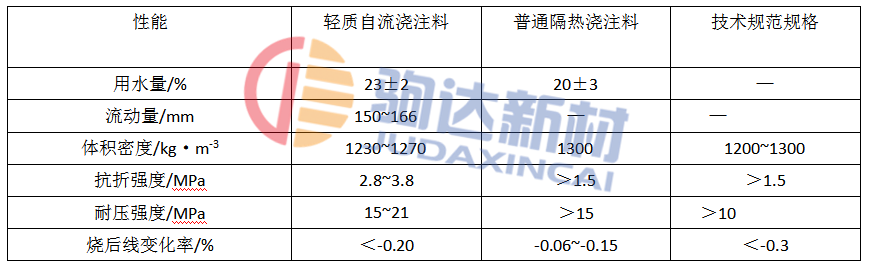 經(jīng)試驗(yàn),自流澆注料的基本配方(%)為:礬土水泥30~35,陶粒45~55,超細(xì)粉15〜 20,硅灰1.5 ~2.0,以及適量的分散劑,澆注料性能見(jiàn)表2。