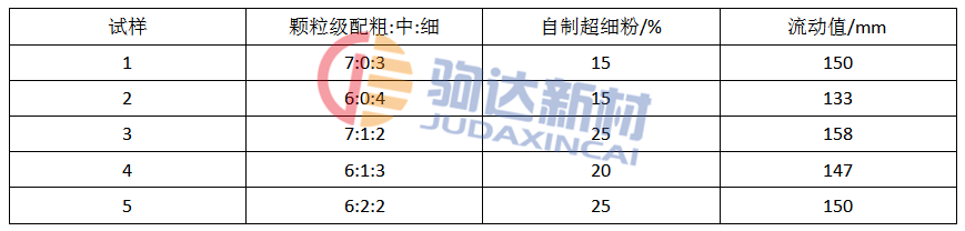 骨料對(duì)流動(dòng)性的影響表現(xiàn)在多方面:顆粒形狀,級(jí)配,粒徑,吸水性等。顆粒的形狀愈接近球形,顆粒間相互接觸的面積愈小,流動(dòng)性愈好。骨料的吸水性小,則混合料用水量在較小的情況下就足以保證形成溶膠并使顆粒之間能夠自由流動(dòng)。顆粒級(jí)配是影響流動(dòng)性能的重要因素。該試驗(yàn)中顆粒范圍為:粗顆粒5〜1.2 mm;中顆粒1.2〜0.3mm;細(xì)顆粒0.3〜0.045mm;超細(xì)粉< 0.045mm。細(xì)粉用量不足時(shí),骨料與細(xì)粉之 間存在著分離傾向,流動(dòng)性差或不流動(dòng);中顆粒用量較多時(shí),因骨料之間的直接接觸,使流動(dòng)性顯著下降;細(xì)粉用量過(guò)多時(shí),則施工后細(xì)粉產(chǎn)生分離現(xiàn)象,或產(chǎn)生高粘度,影響流動(dòng)性。采用不同的粗中細(xì)顆粒級(jí)配,觀察其相應(yīng)的達(dá)到穩(wěn)定的流動(dòng)性時(shí)所需的超細(xì)粉最小用量,試驗(yàn)結(jié)果見(jiàn)表3。