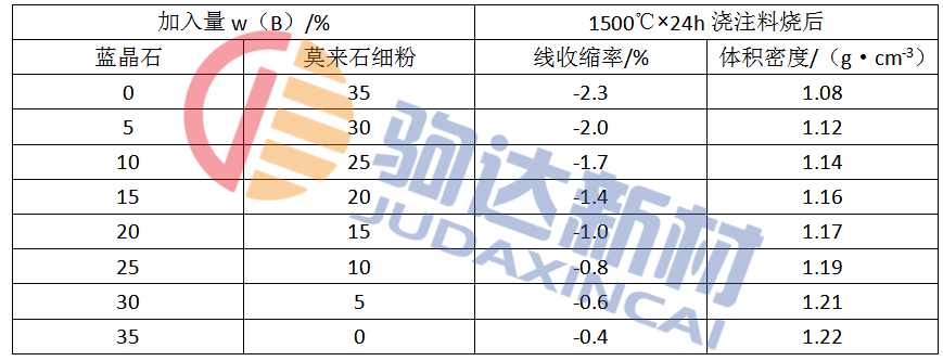 表3 藍(lán)晶石加入量及其對莫來石耐火澆注料性能的影響