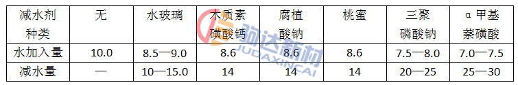 試驗方法:將一定組成的配料分別置于幾個燒杯中,每個燒杯中分別加入不同的減水劑(占配料量的0.3%);水玻璃、木質(zhì)素磺酸鈣、糖蜜、三聚磷酸鈉及α甲基萘磺酸等,并混勻。再逐一以滴定管加水于燒杯中,邊滴邊攪拌,直到開始流動,進(jìn)而較易流動。記下加水量,就得到不加和加入減水劑的加入量(見表2)。