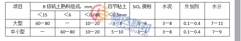由于低水泥高鋁質(zhì)耐火澆注料預(yù)制塊的尺寸較大,最大尺寸達(dá)4m以上,重量1噸以上,需室外露天成型。冬夏溫差達(dá)數(shù)十度,致使凝結(jié)時間有很大的波動。夏季氣溫達(dá)30℃以上,凝固快,往往來不及成型,泥料已凝結(jié):而冬季氣溫在0℃左右,3—5d尚不能凝結(jié),占用大批模具。因此,在夏季需加入緩凝劑,在冬季需加入促凝劑,以調(diào)整作業(yè)時間。根據(jù)不同的產(chǎn)品及其工藝要求,初凝時間不早于40min至2h,初凝時間不晚于4—6h。緩凝劑可用糖蜜等,促凝劑可用MS水玻璃速凝劑,用量均在1%—3%。應(yīng)當(dāng)指出,有的促、緩凝劑兼有減水作用。