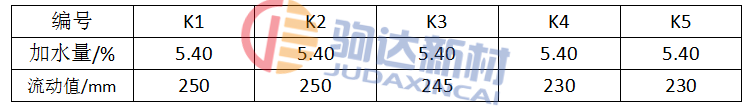 流動值測定方式:將攪拌好的料裝進高(60±0.5)mm,上口內(nèi)徑為Φ(70±0.5)mm,下口內(nèi)徑Φ(100±0.5)mm的截錐圓模中,并放置在GZ-85型水泥膠砂振動臺上,待料表面返漿后,輕輕拔掉圓錐體震動30s,使拌合料自由平鋪開來,測4個方向的直徑并取平均值,即是該料的流動值。