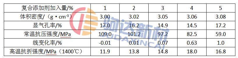 表2 復(fù)合添加劑對(duì)1500℃3h燒后澆注料性能的影響