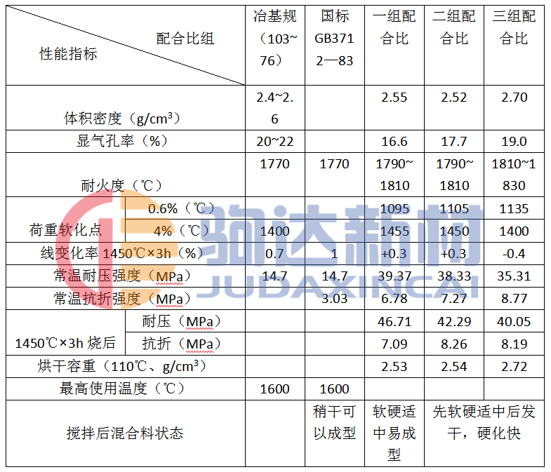 表1 磷酸鹽澆注料性能試驗(yàn)指標(biāo)表