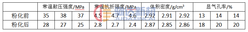 通常在低水泥耐火澆注料生產(chǎn)后自然養(yǎng)護(hù)過(guò)程中,24h之內(nèi)為自然反應(yīng)排氣階段,坯體微熱,表面慢慢硬化,經(jīng)過(guò)3~5天的放置后,表面就會(huì)出現(xiàn)起皮現(xiàn)象,在氣泡孔隙的周?chē)霈F(xiàn)白色的細(xì)粒,輕輕用手按壓發(fā)現(xiàn)表面3~5mm已經(jīng)發(fā)軟,并逐漸粉化剝落,有的甚至達(dá)10~15mm,這勢(shì)必影響產(chǎn)品的結(jié)構(gòu)強(qiáng)度,導(dǎo)致產(chǎn)品使用壽命大大降低,以至不能使用。取剛澆注凝結(jié)的樣品和粉化后的樣品進(jìn)行物理指標(biāo)檢測(cè)。其結(jié)果見(jiàn)表1。