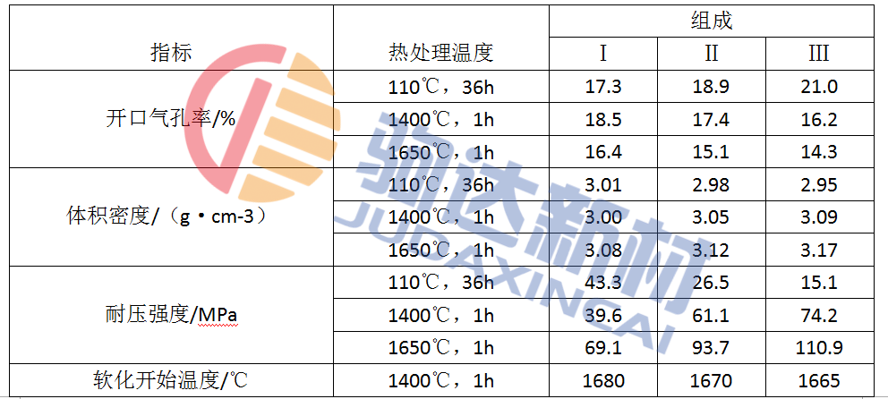 根據(jù)在0.2N·mm-2荷重下軟化開始溫度測定的結果,查明混合型結合相組分比例的變化沒有引起該指標發(fā)生較大的變化。雖然,這是由于結合劑粘度相當高和不反應熔體的數(shù)量不多所致。用在1400℃下烘焙、并保溫1h的試樣進行了測定。