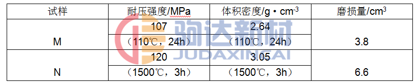 從耐磨性試驗(yàn)方法可看出,要想得到好的耐磨性,試樣必須有較高的耐壓強(qiáng)度,骨料與基質(zhì)的硬度較大,骨料與基質(zhì)的結(jié)合強(qiáng)度也應(yīng)很好。本實(shí)驗(yàn)用的骨料和基質(zhì)為合成料,其莫氏硬度較高。為7.5~8.5,致密度也高,具有金屬及非金屬的諸多性能。因此研制的澆注料具有較好的耐磨性。為驗(yàn)證這一點(diǎn),分別采用合成料和白剛玉為原料,加入相同的添加劑及結(jié)合劑,制成高強(qiáng)超耐磨澆注料(M)和低水泥剛玉澆注料(N),測(cè)其耐壓強(qiáng)度、體積密度及常溫磨損量,結(jié)果見(jiàn)表2。