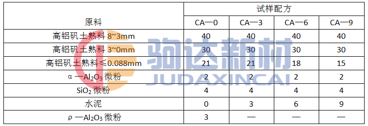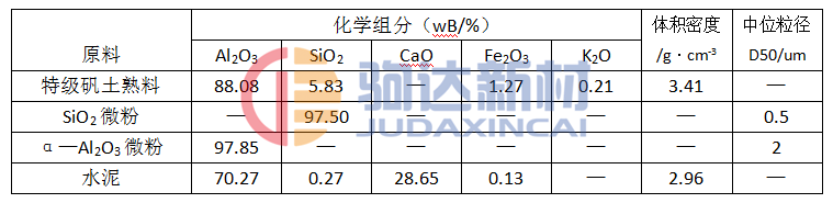 高鋁澆注料所用主要原料有特級礬土熟料、SiO2微粉、α—Al2O3微粉、ρ—Al2O3微粉和純鋁酸鈣水泥,其理化性能指標如表1所示。