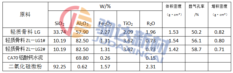 試驗(yàn)所用原料主要有普通輕質(zhì)高鋁骨料、輕質(zhì)高強(qiáng)微孔礬土骨料、漂珠、藍(lán)晶石和二氧化硅微粉,以CA70鋁酸水泥為結(jié)合劑,外加分散劑。部分原料的理化性能見表1。