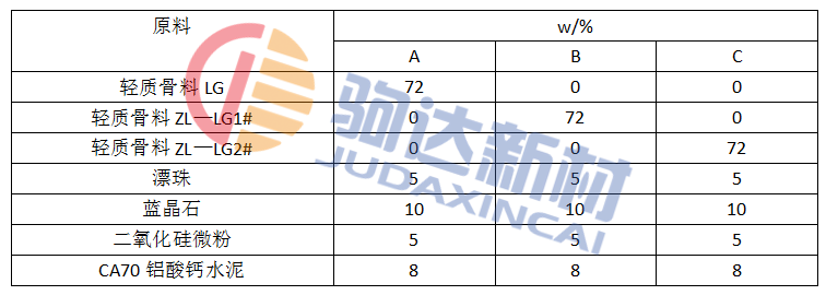 為研究3種輕質(zhì)骨料對(duì)澆注料性能的影響,將耐火骨料和粉料按照5:5的質(zhì)量比混合均勻,保證實(shí)驗(yàn)配比不變,只改變所添加輕質(zhì)骨料種類,制備3組試樣A、B和C,分別代表利用骨料LG、ZL—LG1#和ZL—LG2#制備的澆注料試樣。具體配比交表2。