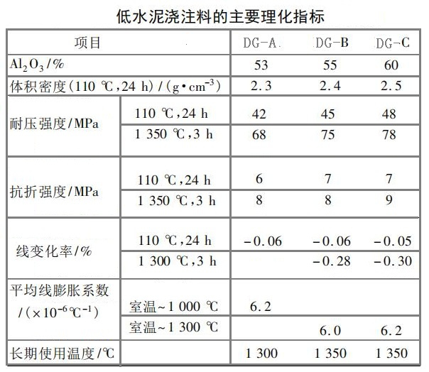 我公司DG-A、DG-B低水泥澆注料主要用在工業(yè)爐預(yù)熱段,工作溫度一般為 800 ~ 1 000 ℃ ; DG-C、DG-D 低水泥澆注料通常用在工業(yè)爐加熱段和均熱段,工作溫度一般為1200~1 300 ℃。各種低水泥澆注料的主要理化指標(biāo)列于表1。