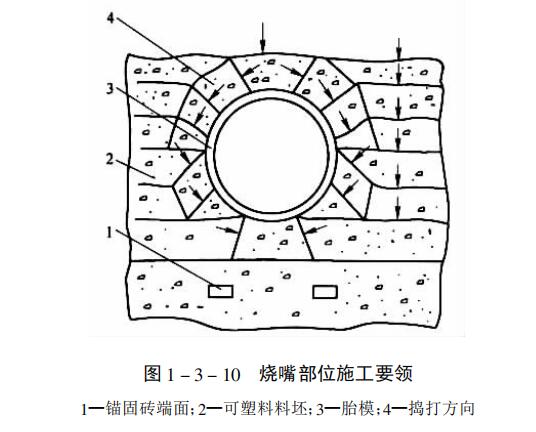 搗打耐火可塑料爐墻時(shí),首先將料坯緊密無(wú)間的平擺起來(lái),只準(zhǔn)擺一層料坯。工作面 側(cè)應(yīng)安放完整無(wú)損的料坯,其內(nèi)側(cè)允許安放掉角、破損的料坯或修整下來(lái)的碎料;其次用搗固機(jī)或風(fēng)鎬搗打,錘頭沿爐墻長(zhǎng)度方向行走,錘頭面應(yīng)疊壓1/4左右。整個(gè)料坯面搗打2~3遍即可錯(cuò)縫鋪置下一層料坯,然后繼續(xù)搗打,依此類(lèi)推;第三,當(dāng)遇到錨固磚時(shí),將爐墻可塑料搗打至錨固磚上表面,在安裝磚的位置挖去部分料,放置壓模,打進(jìn)可塑料中,當(dāng)達(dá)到安放錨固磚的尺寸時(shí),將壓模取出,安裝錨固磚。這樣能使錨固磚與耐火可塑料緊密咬合,防止竄火,同時(shí)也防止?fàn)t墻內(nèi)傾或倒塌;第四,當(dāng)遇有孔洞時(shí),例如燒嘴部位,其施工要領(lǐng)見(jiàn)圖2。當(dāng)爐墻搗打面至燒嘴下表面約為100mm時(shí),牢固地安裝胎模,一層層的鋪料坯,分層進(jìn)行搗制。每層施工時(shí),先搗打胎模周?chē)吓鳎俅蛩戒伒牧吓,最后封口?/FONT>