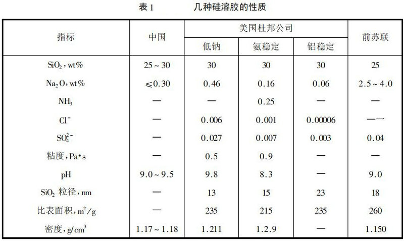 硅溶膠即硅酸溶膠,呈乳白色膠液,帶負(fù)電性,其通實(shí)為xSiO2·H2O,由下列成分構(gòu)成:偏硅酸(H2SiO3),二偏硅酸(H2SiO2)2,和正硅酸(H4SiO4)。膠體粒子約10~80mm。硅溶膠的制備方法很多,如水解四乙氧基甲硅烷:電解、滲析、電滲析硅酸鈉溶液:水解四氯化硅或硅酸酯:用氣態(tài)氟處理硅酸鈉:分散硅凝膠懸浮液等。最廣泛使用的方法有酸法、離子交換法和電滲析法。各種硅溶膠的性質(zhì)如表1