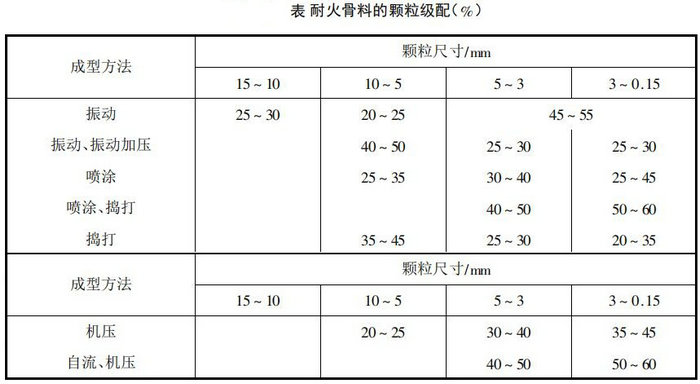耐火骨料分為粗骨料和細骨料。一般顆粒尺寸大于5mm的稱為粗骨料;5mm及5m以下至 0.09mm的稱為細骨料。骨料臨界粒徑根據(jù)村體厚度而定,一般為10mm或15mm,大型構筑物如高爐基墩和鋼包澆注料等,可采用20mm或25mm的顆粒。另外,施工制作方法不同,耐火骨料的臨界粒徑也不同,詳見下表。目前,耐火骨料臨界粒徑有增大的傾向,應當指出,在配制不定形耐火材料時,其耐火骨料顆粒級配應符合表中的技術要求,即使用統(tǒng)料,也應篩分檢驗達到其要求,方可使用。