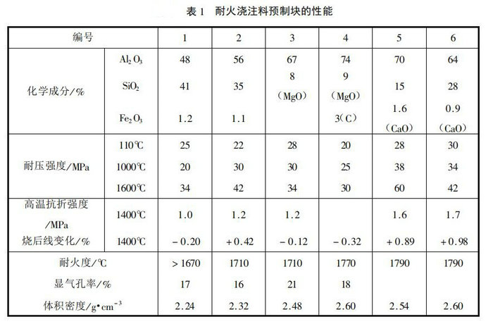 應當指出,凡是耐火澆注料和耐火可塑料等材料,均可作預制塊。由于生產條件比現(xiàn)場施工好,因此性能也有所提高,一般可參見前述有關性能,F(xiàn)舉例,見表1。編號1和編號2為 CA-50水泥和磷酸黏土質澆注料預制塊,其骨料為小于10mm的黏土熟料顆粒70%,小于0.09mm的高鋁粉分別為15%和30%,CA-50水泥分別為15%和2.5%。前者摻加減水劑,水用量為10%。后者用濃度為42.5%的磷酸作結合劑,用量13%;編號3和編號4為水玻璃鋁鎂質澆注料預制塊,其骨料和粉料為一級礬土熟料,小于5mm的骨料用量60%,粉料分別為30%和26%,制磚鎂砂粉10%,模數(shù)為2.8、密度為1.32g/cm³的水玻璃用量9%,后者加4%的鱗片石墨;編號5和編號6分別為低水泥和超低水泥高鋁質澆注料預制塊。預制塊的形狀,主要有方形、長條形、拱形和環(huán)形等,均為特異形制品。