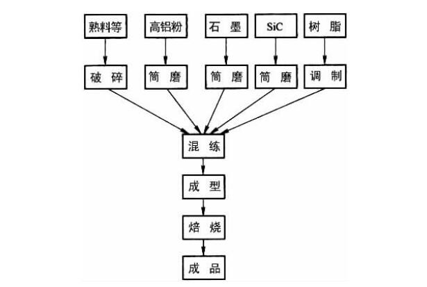 鋁炭磚的生產(chǎn)工藝流程。其技術措施是耐火骨料多級級配,外加物或固體結合劑與耐火粉料制成預混合粉,同時摻加適量的外加劑;炝蠒r,先加顆粒料和結合劑,待顆粒料完全被結合劑包裹后,再加各種粉料,混練15~20min;拌和料在300T 壓磚機上成型,加壓次數(shù)不少于10次。壓磚機噸位越大,加壓次數(shù)越少,但不得少于5次、同時,操作應先輕后重,便于排氣和減少裂紋。