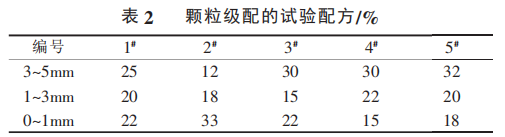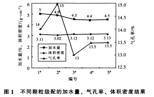 原料是以棕剛玉為骨料,碳化硅、水泥、uf-SiO2、α-Al2O3 為基質(zhì),試驗用澆注料的骨料采用≤1mm、1 ~3mm、3~5mm 三級粒度。骨料和粉料的質(zhì)量比為 63~70∶37~30。澆注料的致密程度和流動性跟顆粒級配密切相關(guān),而最佳的顆粒級配又隨骨料種類、臨界粒度的大小和基質(zhì)組成的不同而不同,最合適的顆粒級配應(yīng)該由試驗確定。本試驗選擇5種不同的顆粒級配,細(xì)粉部分全部相同,顆粒級配的試驗配方如表2所示。這5個配方的試驗結(jié)果示于圖1。