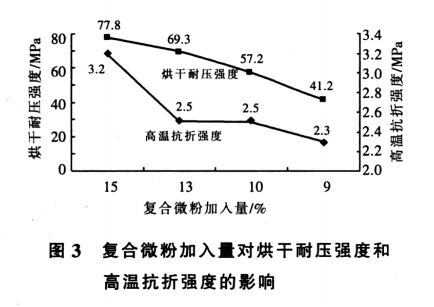 從圖1可知,3#、4#、5# 的顆粒組配較好,再綜合考慮強度指標(biāo),決定選擇 3#作為以后試驗的顆粒級配。本澆注料屬于低水泥系列,難點在于既要在1500℃保溫 0.5h 后獲得較高的高溫抗折強度值又要具有較高的烘干耐壓強度。因為烘干耐壓強度主要來源于水泥的水化,為了得到較高的烘干耐壓強度,勢必要加入較多的水泥,而較多的水泥又會使高溫下的液相量增加,使高溫抗折強度下降,前期的試驗工作已經(jīng)證實了這一點。為了解決這個矛盾, 必須在優(yōu)化基質(zhì)上下功夫,也就是uf-SiO2和α-Al2O3 復(fù)合微粉的加入量要進(jìn)行嚴(yán)格的控制, 既要發(fā)揮uf-SiO2 的結(jié)合作用來增加強度,又要控制高溫下的液相量使高溫抗折強度達(dá)標(biāo)。 本試驗將水泥的加入量定為2%,考察復(fù)合微粉的加入量對常溫耐壓強度和高溫抗折強度的影響試驗結(jié)果示于圖3。