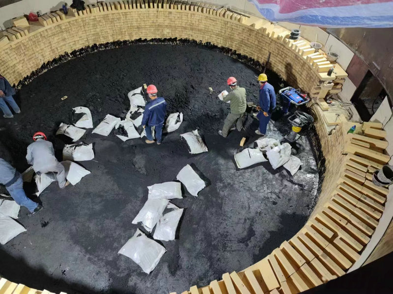 保溫電弧爐熱熔渣經(jīng)調(diào)質(zhì)后熔渣為酸性熔渣,酸度系數(shù)1.7-1.8。爐墻耐火材料經(jīng)酸性熔渣沖刷,導(dǎo)致使用壽命十分有限,熱熔渣中CaO-SiO2含量占比70%。爐墻耐火材料在熔渣出渣時(shí)液位降低導(dǎo)致?tīng)t墻與空氣接觸使耐材氧化嚴(yán)重。爐底因熔渣未全部倒出形成保護(hù)層且溫度穩(wěn)定,采用預(yù)焙碳磚砌筑爐底可行。