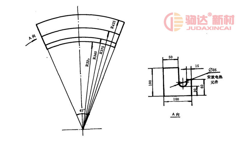 用重質(zhì)耐火磚作為爐襯耐火層而原有的爐膛尺寸不變,耐火磚的尺寸如圖根據(jù)原爐膛直徑而定圖中耐火磚適用于爐膛直徑φ1200的井式爐,改造省去擱絲磚保溫層仍用原有的保溫材料砌筑填充,電爐其它部位無需任何改動。 所需異型耐火磚可由耐火材料廠定做