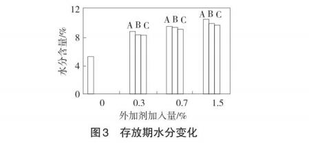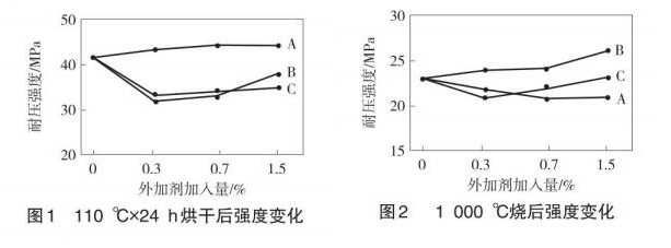 各試樣120℃×2h烘后,保存50d,其水分含量見(jiàn)圖3。以不加外加劑0與加3種外加劑A、B、C的料對(duì)比看,A、B、C都有一定的促進(jìn)高鋁質(zhì)磷酸鹽澆注料保存作用,且隨著保存劑用量的增加,保存效果更為明顯。相對(duì)看,草酸的保濕效果好。保濕性好則代表施工性能更好。