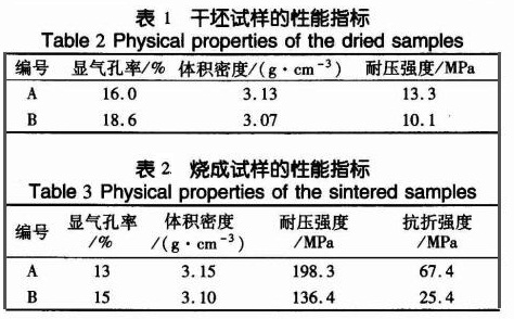 干坯的常溫性能指標如表1,可燒成試樣的常溫性能指標見表2.從表1中可以看出,加入硅粉后,坯體趨于致密化,顯氣孔率降低,體積密度、耐壓強度都提高了。這說明加入硅粉后,在壓力相同時,材料的組織結(jié)構(gòu)比原先更加致密。