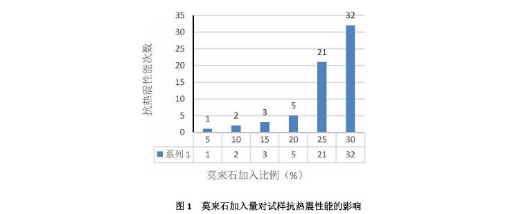 (2)莫來(lái)石的加入量在20%以下時(shí),制品的抗熱震性能提升緩慢,對(duì)實(shí)際應(yīng)用意義不大。莫來(lái)石加入量過(guò)多,抗熱震性能雖然會(huì)進(jìn)一步提高,但其它物理性能則會(huì)下降,綜合考慮,莫來(lái)石加入量為25%~30%,制品的體積密度,顯氣孔率,耐壓強(qiáng)度適中,抗熱震性良好,各項(xiàng)指標(biāo)均能滿足使用。