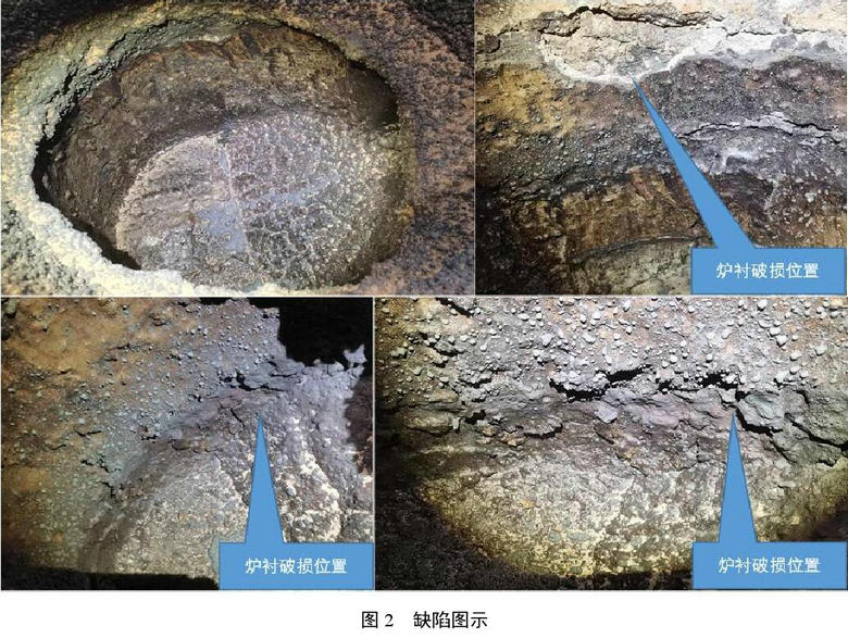 在鐵水包內(nèi)進(jìn)行孕育處理時(shí),鐵水運(yùn)動(dòng)劇烈,加重了襯體的侵蝕。采用鑄造用除渣劑對(duì)鐵水表面的熔渣進(jìn)行聚集和粘結(jié),在除渣過程中熔渣會(huì)變粘,易掛在襯體壁上,難以清理。加上攪動(dòng)鐵水的沖刷,以及間歇式作業(yè)所造成的溫度波動(dòng),在鐵水包內(nèi)襯,特別是渣線部位耐火澆注料的損毀加劇,如圖2所示。
